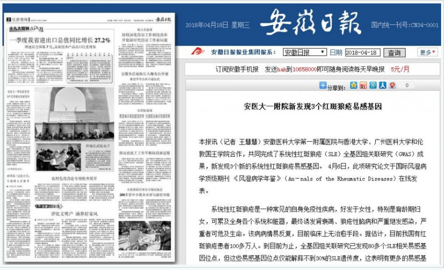 安徽日报:安医大一附院新发现3个红斑狼疮易感基因