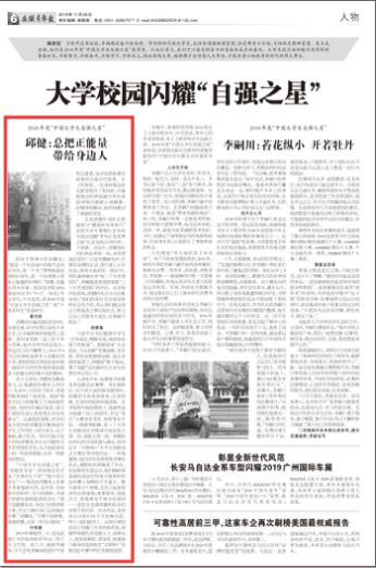 “中国大学生自强之星”、“启航奖学金”、国家励志奖学金、“优秀学生干部”、“校十佳大学生”……现在的邱健身上有着许多荣誉的光环,是学弟、学妹眼中的标杆、学习的榜样,为迷茫的新生指明前进的方向。“我只是踏踏实实,为自己的理想努力着,尽全力做好自己应该做好的事。”邱健说,“只要不怕困难,顽强拼搏,大家一样可以做到。”