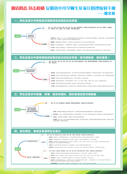 《安徽省中小学生师生及家长心理应对手册》对中小学师生及家长中新型冠状病毒感染的重症住院患者;居家隔离或到医院就诊的轻症患者(密切接触者、疑似患者);家属、同事、朋友有确诊、疑似患者或密切接触者;身处疫区、易感及普通师生等人群可能出现的不良情绪提出应对方法。