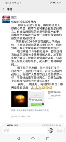 “刚刚听到这个噩耗,相信知道的人都痛心不已!两天看诊300个病患而抵抗力下降的你,不幸染上新冠就此与我们永别,您可知道,我们大家等着和您拍胜利的照片!看了您的朋友圈,您也是实打实的白衣战士,是我们的战友。在这没有硝烟的战场上,我们广大的白衣战士定会像您一样,不畏惧病毒不畏惧死亡,在战场上与死神作顽强的拼搏斗争!英雄,一路走好,我们的小彭医生!愿天堂没有病痛!”2月20日晚,凌云在朋友圈里撰写了祭文,悼念自己的战友和朋友彭银华,并表示:她和广大医务人员,都将继承彭银华的遗志,继续在抗疫第一线,前赴后继、顽强拼搏,坚决打赢这场疫情防控的人民战争、总体战、阻击战!