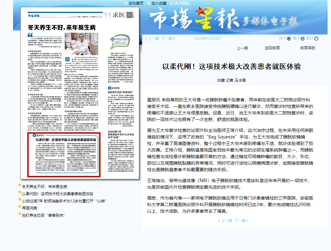 据为王大爷复诊检查的泌尿外科主治医师王琦介绍,这次治疗过程,在未采用任何麻醉措施的情况下,运用了改良的“Bag Squeeze”手法,为王大爷完成了膀胱软镜镜检,并采集了高清图像资料,整个过程中王大爷未感到疼痛与不适,就诊体验得到了极大改善。王琦介绍,膀胱癌是我国老百姓中最为常见的泌尿生殖系统肿瘤之一,而膀胱镜检查与活检是诊断膀胱癌最可靠的方法,通过镜检可明确肿瘤的数目、大小、形态、部位以及周围膀胱黏膜的异常情况,同时可进行活检以明确病理诊断,定期接受膀胱镜检也是膀胱癌患者术后最重要的随访手段。