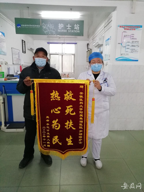 安徽网、大皖客户端讯 宴席上,一位老人突然倒趴在桌,危急时刻,正在附近吃饭的巢湖护士尹婷婷观察老人情况后,立刻采取海姆立克急救方法施救,施救后老人身体状况得到好转。“丫头,我找了你一个月了,我的命是你救回来的呀!”2020年12月7日上午10时许,安医大附属巢湖医院感染疾病科的专家门诊迎来了一位特殊的访客,老人眼含热泪找到了正在科室上班的尹婷婷护士亲手送上锦旗,感谢她的救命之恩。