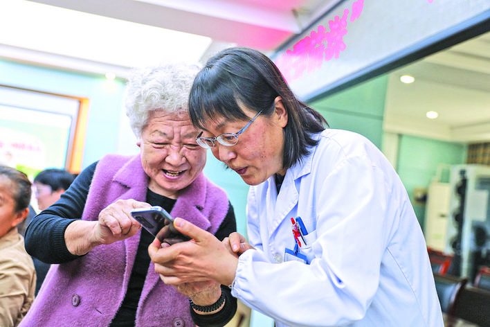 老人在跟医生分享家中的喜事。