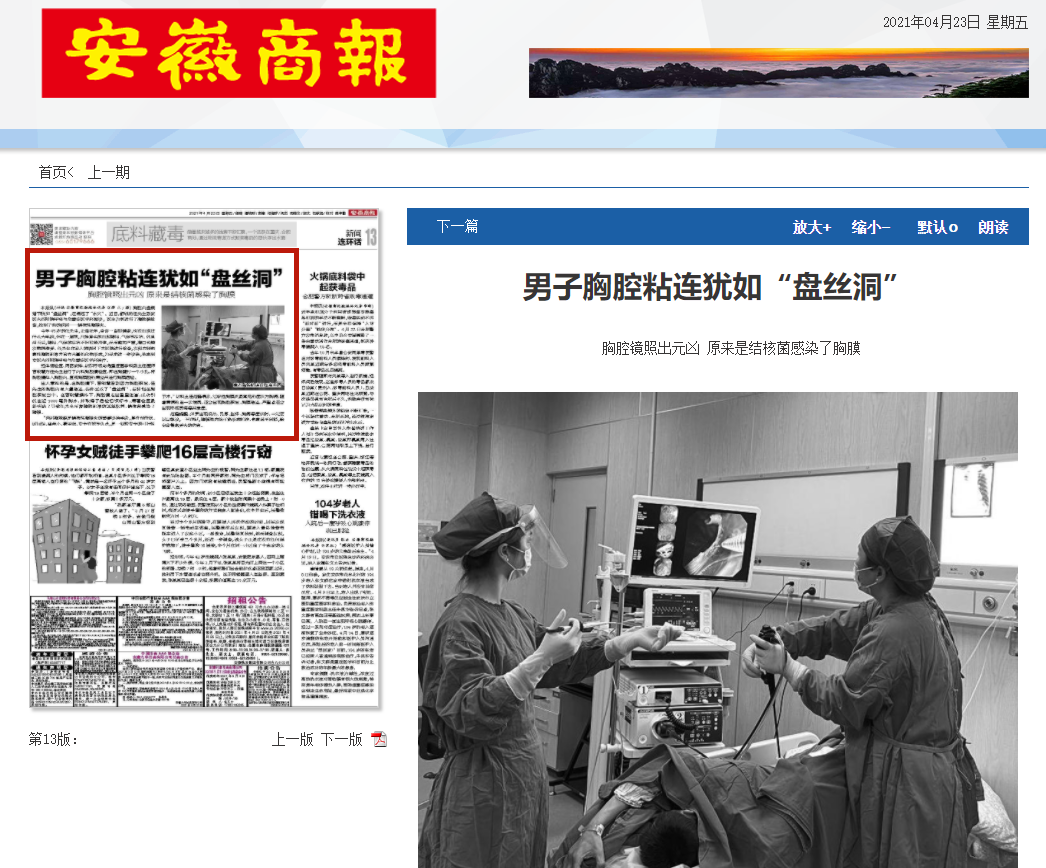 本报讯(付艳 安徽商报融媒体记者 汪漪 文/摄) 胸腔内盘根错节犹如“盘丝洞”,还闹起了“水灾”。近日,舒城的任先生到安医大四附院呼吸与危重症医学科就诊,医生为其进行了胸腔镜检查,找到了他的病因——结核性胸膜炎。