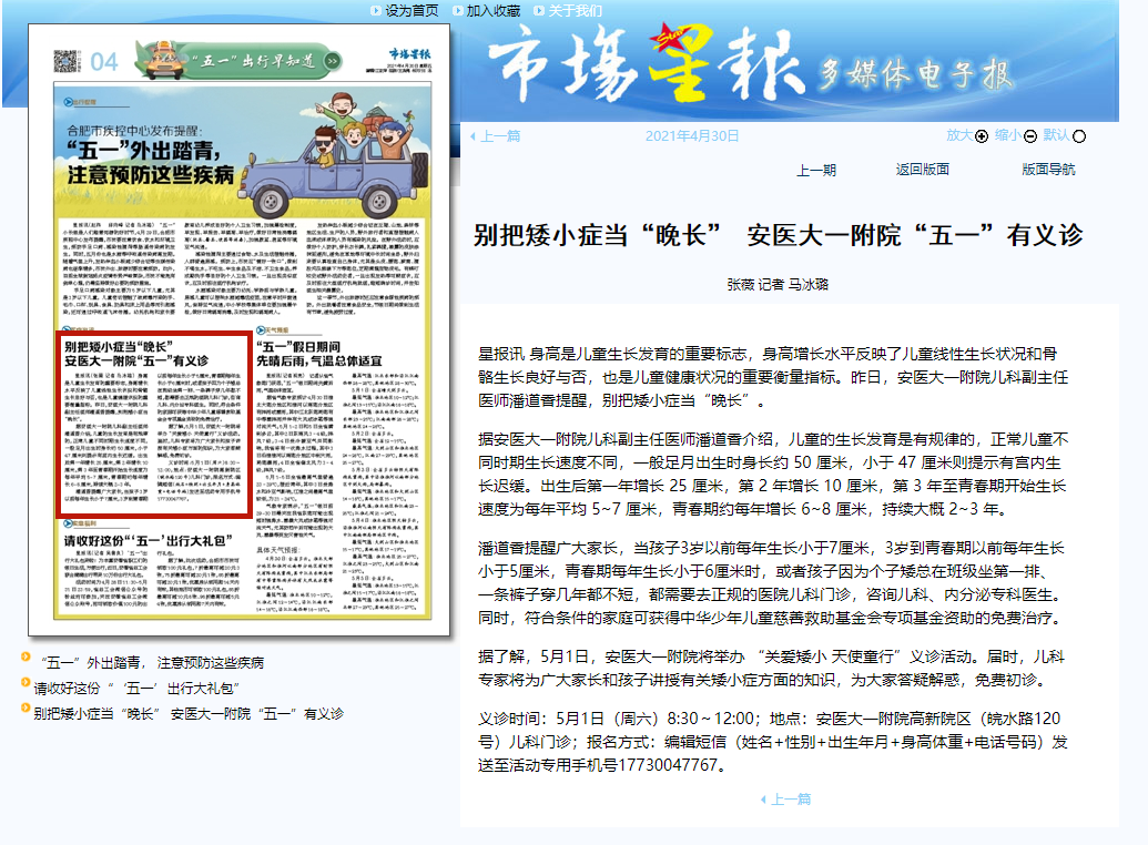 市场星报:别把矮小症当“晚长” 安医大一附院“五一”有义诊