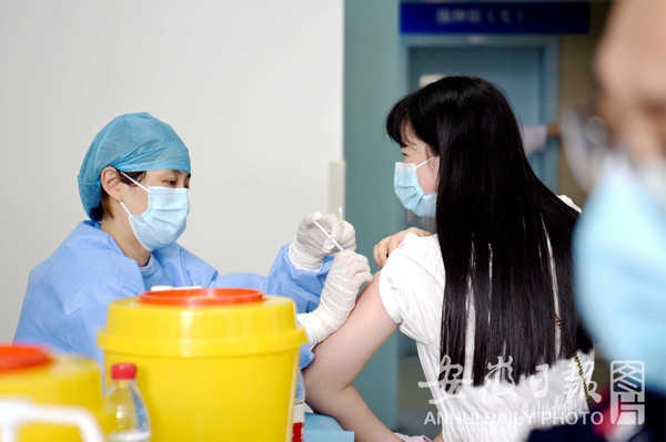 5月14日,在合肥安医大二附院,市民排队接种疫苗,现场秩序良好。