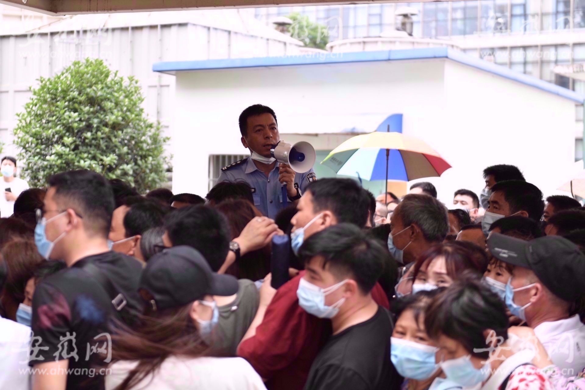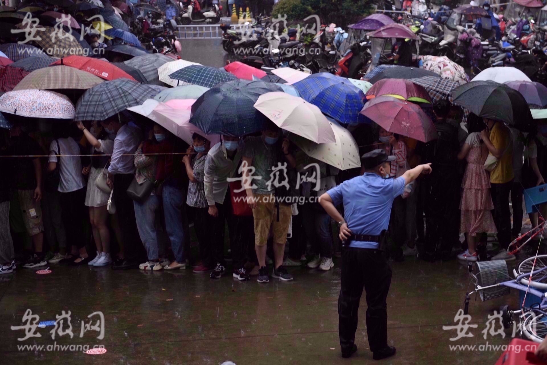 上午9点50左右,一场暴风雨来临,市民们依然撑着雨伞在现场排队,等待接种新冠疫苗。新安晚报、安徽网、大皖新闻记者注意到,民警站在暴雨中,衣服淋湿,还有民警用身体挡在警戒线旁边,维护秩序。