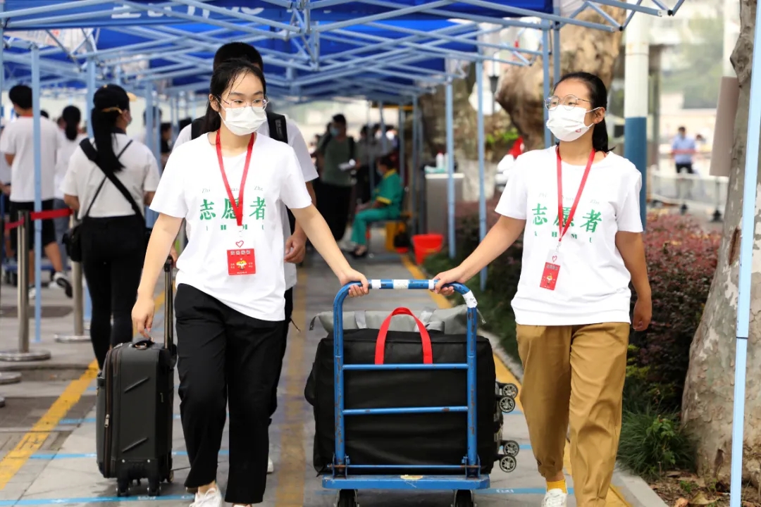 “同学,请扫码、测温后进入。”“同学,你好!请进行手部消毒。”“同学,你好!请更换口罩。”“同学,你好,我帮你拿行李。”“同学,你好!你是哪个学院的?我帮你把行李带去报到地点。”到达学校,身穿统一服装、佩戴红色胸牌的志愿者们则在北门、图书馆门口、青年志愿者岗亭等校园各个服务点,热心地为新生提供托运行李、报到指导、问题解答等全流程服务。他们分工明确、各司其职,面面俱到的服务留下无数温暖瞬间,令新生啧啧称赞。