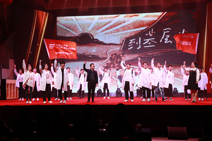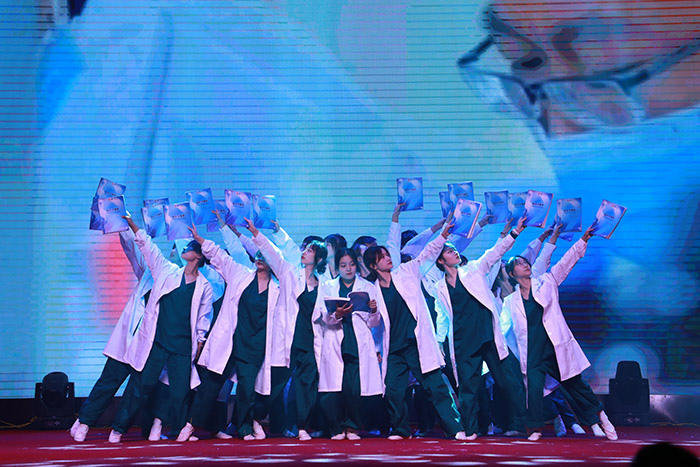 “逐梦青春正当时”篇章中,民乐合奏《我和我的祖国》《赛马》热情讴歌了师生对祖国母亲的深深热爱之情,舞蹈《恰同学少年》《理想照耀新征程》《攀登,攀登》和话剧《灯火》,讲述了九十五年来一代代安医人奋发图强,用坚韧与勇敢彰显初心如磐的故事,表达了一代代安医人继续阔步向前、再续辉煌的决心。