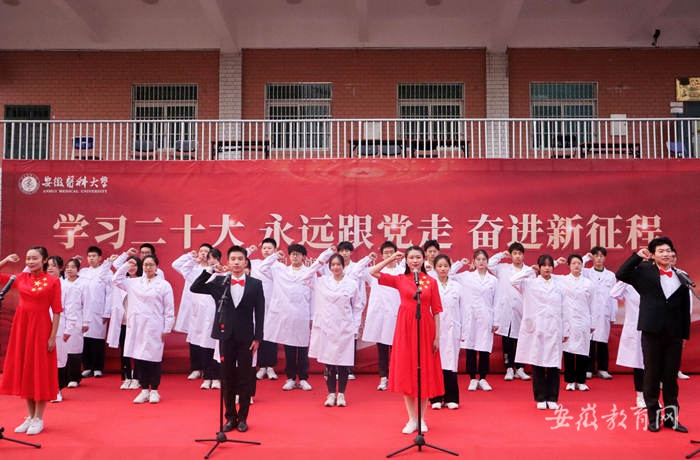 谢瑞瑾在国旗下宣讲党的二十大精神时说,作为未来的大国良医,同学们更应积极主动学习宣传贯彻党的二十大精神,切实把思想和行动统一到党的二十大精神上来,积极投身医疗卫生事业,矢志不渝护佑人民健康。他强调,作为新时代的安医青年,要勇做好学的榜样,始终牢记要学习知识,更要学会思考,学会研究的态度,学会终生受用的学科思维方式,用好施展才干的舞台,用真才实学照亮实现梦想的前景。要勇做力行的先锋,志存高远,奋进向上,提升价值塑造,把对祖国血浓于水、与人民同呼吸共命运的情感贯穿在学业全过程、融汇在良医路的实践中,在新征程上用实际行动彰显责任担当,更加奋发有为地为推进中华民族伟大复兴贡献青春力量。要勇做良医的典范,以有理想、敢担当、能吃苦、肯奋斗的青春姿态走好良医路,行好良医事,自觉弘扬“弘毅担当、精医报国、康民济世”的安医精神,以精湛医术成为生命的守护者,以高尚医德成为医疗卫生事业的忠诚践行者。