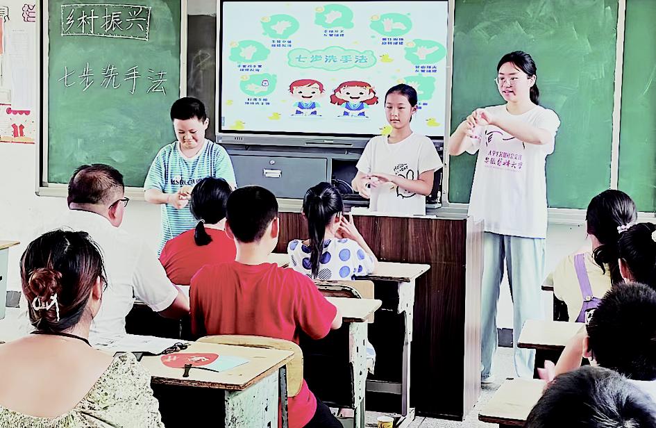 习近平总书记强调:“有多大担当才能干多大事业,尽多大责任才会有多大成就。”为着力引导青年大学生深入学习领会习近平新时代中国特色社会主义思想,在学以致用的实践中做到“学思用贯通、知信行统一”。该校“红医乡守,科普护航”暑期实践团面向巢湖市中垾镇幼儿园和留守儿童之家开展学龄前儿童生理保健和护理知识宣讲,向孩子们普及了七步洗手法、海姆立克急救法等。实践团成员们将知识宣讲与现场演示相结合,绘声绘色地展示了针对不同年龄阶段的异物堵塞气道时的急救方法和科学正确的牙齿、眼睛、手卫生防护方式。