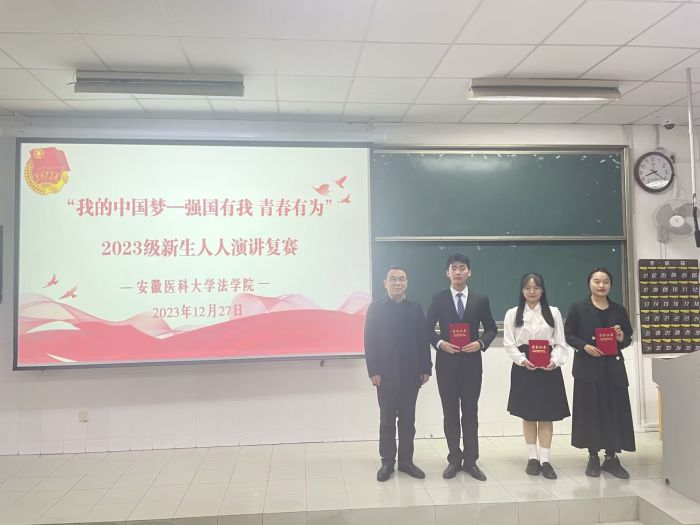 2023年12月27日晚,法学院举办“我的中国梦——强国有我,青春有为”人人演讲复赛。校党委常委、组织部部长李阳新,宣传部常务副部长单永强及护理学院党委书记薛磊受邀担任评委,并为获奖选手颁奖。该院党委书记夏会林、院党委副书记刘燕出席活动。