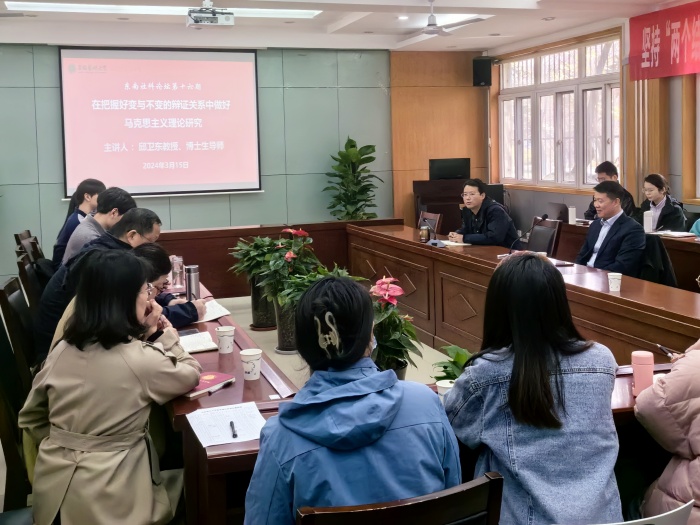 3月15日上午,东南社科论坛(第十六期)在马克思主义学院一楼会议室举行。该院副院长储著源主持报告会,华东理工大学马克思主义学院副院长、法学博士、博士生导师邱卫东教授受邀担任主讲人,作题为《在把握好变与不变的辩证关系中做好马克思主义理论研究》的报告。