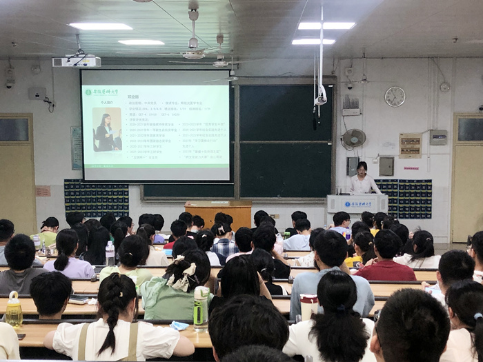校“十佳本科生”“悦群十佳创新创业之星”获得者梁宏宇、张郁林,“普盛十佳自强之星”获得者、“互联网+”大学生创新创业大赛省金银奖获得者邓业丽,推免至北京协和医学院国家卫生健康委科研所的徐可馨,第九届全国大学生基础医学创新研究暨实验设计论坛国家级铜奖获得者丁杨等5名优秀学生党员受邀作分享,围绕医学学习和科研创新等,为学弟学妹们答疑解惑。有的向大家分享了培养科研素养的方法和路径,介绍了文献的分类、不同类型文献阅读的方法等;有的针对大家关心的期末考试,就高效复习、养成良好的学习习惯传授经验;有的详细分析解题方法,帮助学弟学妹们以轻松的心态和正确的方法更好进行英语学习;有的梳理了大学期间的重要赛事及注意事项,结合自己参加各类比赛的成长经历,鼓励大家积极参加比赛,积累经验,厚积薄发。