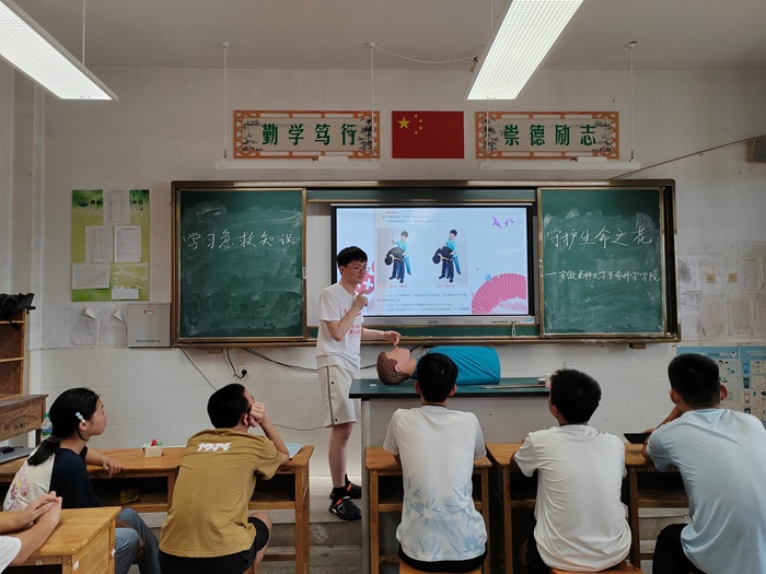 在当地镇村的帮助下,实践团第一时间为许村的孩子们进行作业辅导。队员们发挥学科优势,耐心细致地解答每一个问题,帮助孩子们巩固课堂知识,订正暑期作业。在夏日健康小课堂上,团队成员还用通俗易懂的语言,为孩子们讲解了常见疾病感染与预防等知识,引导他们自觉养成良好的生活作息习惯。在许村中学,实践团开展应急救护知识培训,帮助孩子们掌握实用的生存技能,也将“关爱他人、勇于担当”的社会责任感教育在孩子中传递。