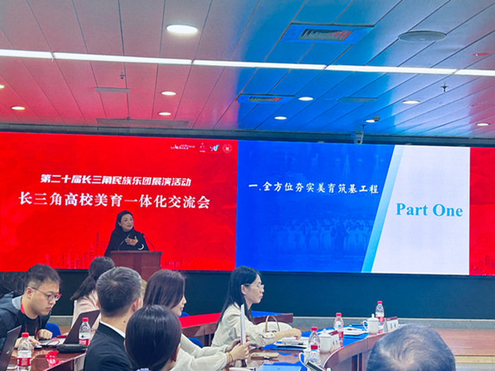 交流会上,各高校艺术教育中心负责人围绕长三角西乐展演计划、美育的创新与实践等内容进行交流。我校仁心民乐团指导教师蔡婕受邀参加活动发言,从课程建设、社团建设、传承发展中华优秀传统文化等方面,分享了我校近年来大学生美育与艺术教育工作情况以及取得的成果。