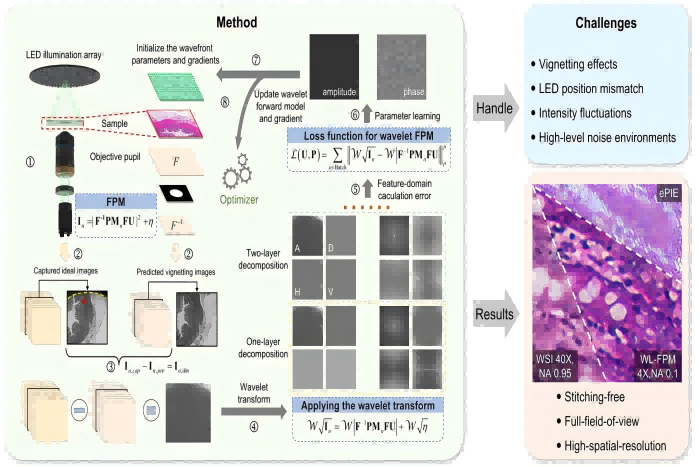 周金华教授团队提出了一种基于小波变换的FPM光学成像模型,名为“WL-FPM”。该模型在传统4f成像模型的基础上引入多尺度小波变换,以提取图像多尺度特征;采用RMSprop优化器,能够实现高保真的振幅和相位图像的迭代重建。WL-FPM的设计使其能够灵活处理诸如LED位置失配、LED强度波动、噪声和渐晕效应等系统误差问题。此外,通过选择合适的小波基,模型显著提升了图像的局部特征和细节捕捉能力。此项研究提出了一个通用型FPM系统框架,在无需增加光学系统的复杂性或修改光学成像系统参数的情况下,成功解决了传统FPM在大尺度像差的校正、渐晕效应、大规模LED位置失配以及多种系统噪声条件下的重建问题。