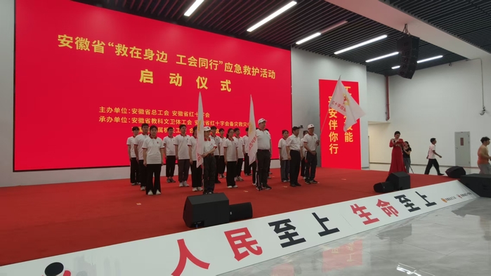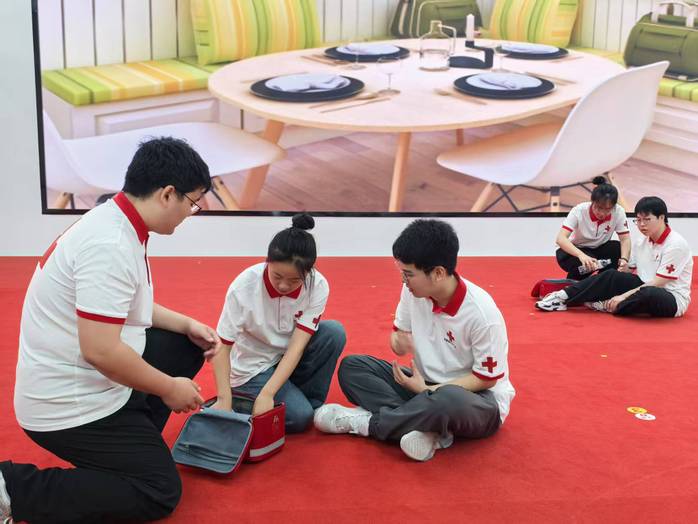 启动仪式分为路演培训环节和志愿服务队授旗仪式。我校学生在安徽省红十字会指导下,参与应急救护情景剧《餐桌上的急救课》表演,展示了海姆立克急救法、烫伤处理、骨折固定等急救技能,让现场观众直观了解了在日常生活场景中如何进行有效的应急救护,获得一致好评。